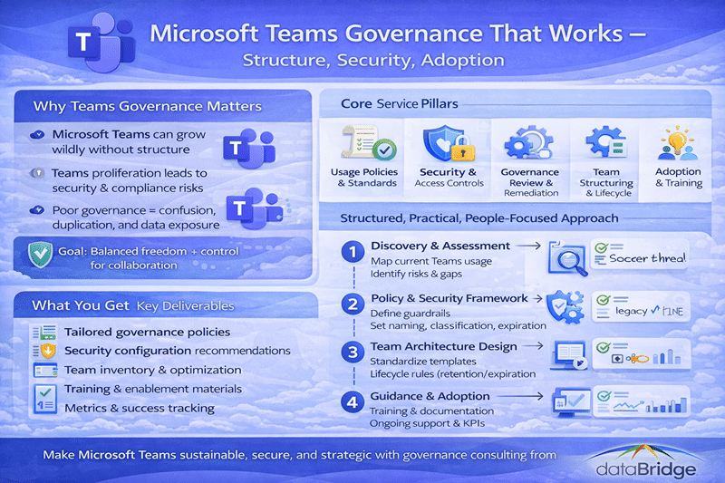 dataBridge helps organizations design, govern, and optimize Microsoft Teams so it supports real work, scales over time, and integrates cleanly with SharePoint and Copilot.