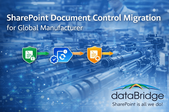 This case study shows how dataBridge helped a global manufacturer address challenges related to document control migration, governance, and structured SharePoint modernization. It highlights the business context, the SharePoint or Microsoft 365 solution delivered, and the outcomes created through stronger architecture, governance, usability, and long-term platform alignment.